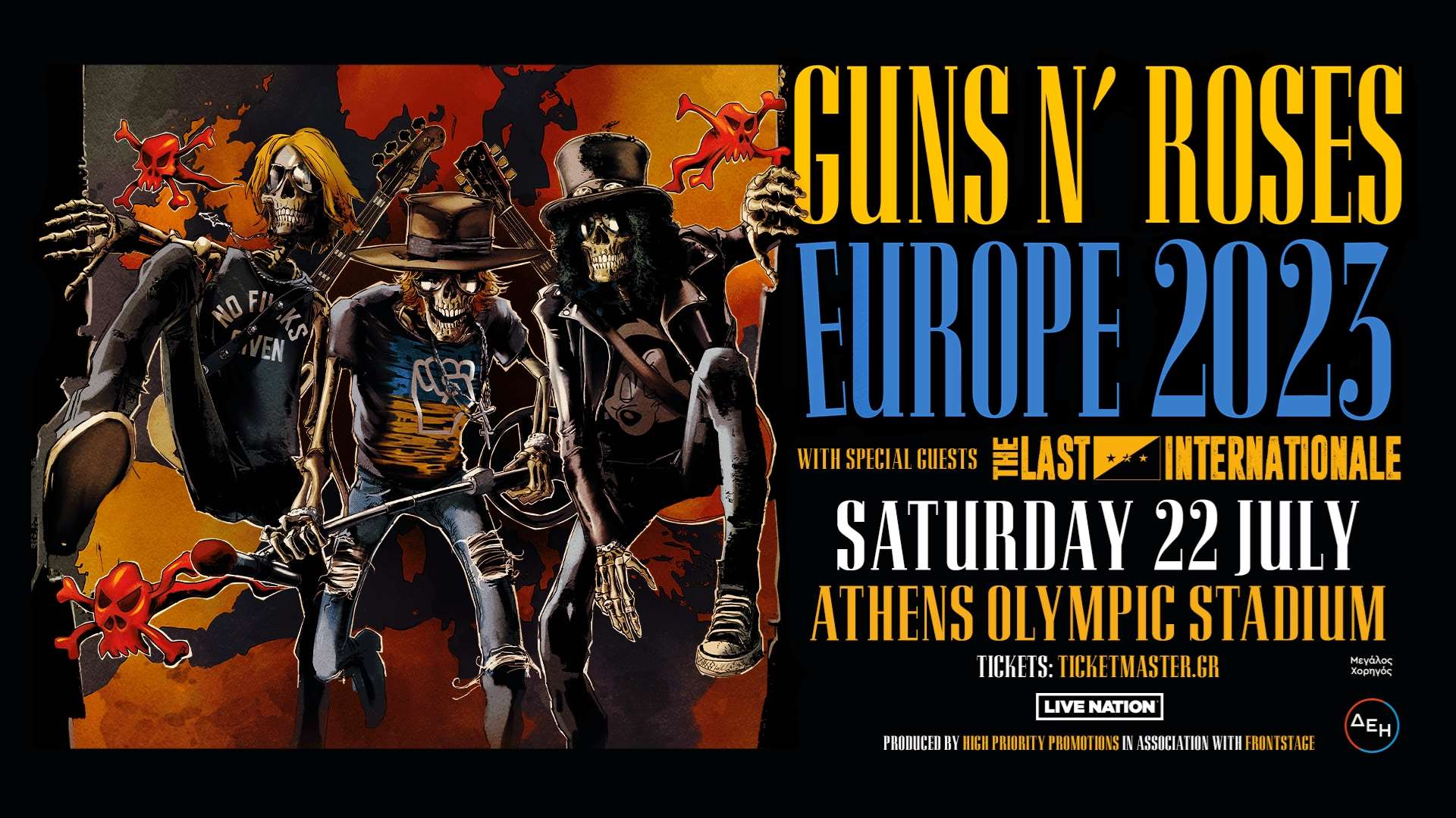 Οι Guns N’ Roses επιστρέφουν με μια τεράστια Παγκόσμια Περιοδεία για το 2023 σε παραγωγή της Live Nation πραγματοποιώντας headline shows σε στάδια, φεστιβάλ και αρένες καθ' όλη τη διάρκεια του καλοκαιριού και του φθινοπώρου. Το εμβληματικό rock συγκρότημα ξεκινάει το ταξίδι του στις 5 Ιουνίου από το Park Hayarkon - Tel Aviv, Israel και συνεχίζει δυναμικά στην Ευρώπη, κλείνοντας τις συναυλίες στην Αθήνα στις 22 Ιουλίου στο Ολυμπιακό Στάδιο.