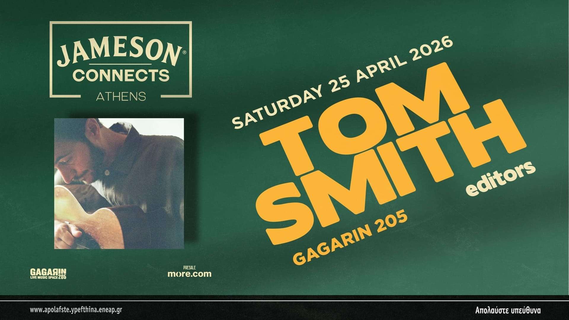 "Τo Jameson Irish Whiskey επιστρέφει με τα JAMESON CONNECTS music sessions και υπερήφανα παρουσιάζει τον Tom Smith, ηγέτη και τραγουδιστή των περίφημων Editors, το Σάββατο 25 Απριλίου 2026 στο Gagarin 205.", λέει το πιο ωραίο email που πήραμε αυτές τις μέρες.