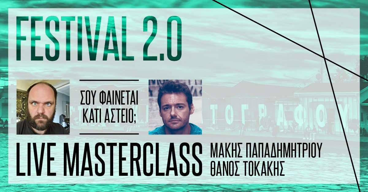 Δύο αναγνωρισμένοι και αγαπημένοι ηθοποιοί, ο Μάκης Παπαδημητρίου και ο Θάνος Τοκάκης μάς εισάγουν στην κωμωδία και στον μηχανισμό του γέλιου μέσα από ένα απολαυστικό YouTube live masterclass το Σάββατο 9 Μαΐου 2020, στις 20:00, στο κανάλι του Φεστιβάλ Κινηματογράφου Θεσσαλονίκης.