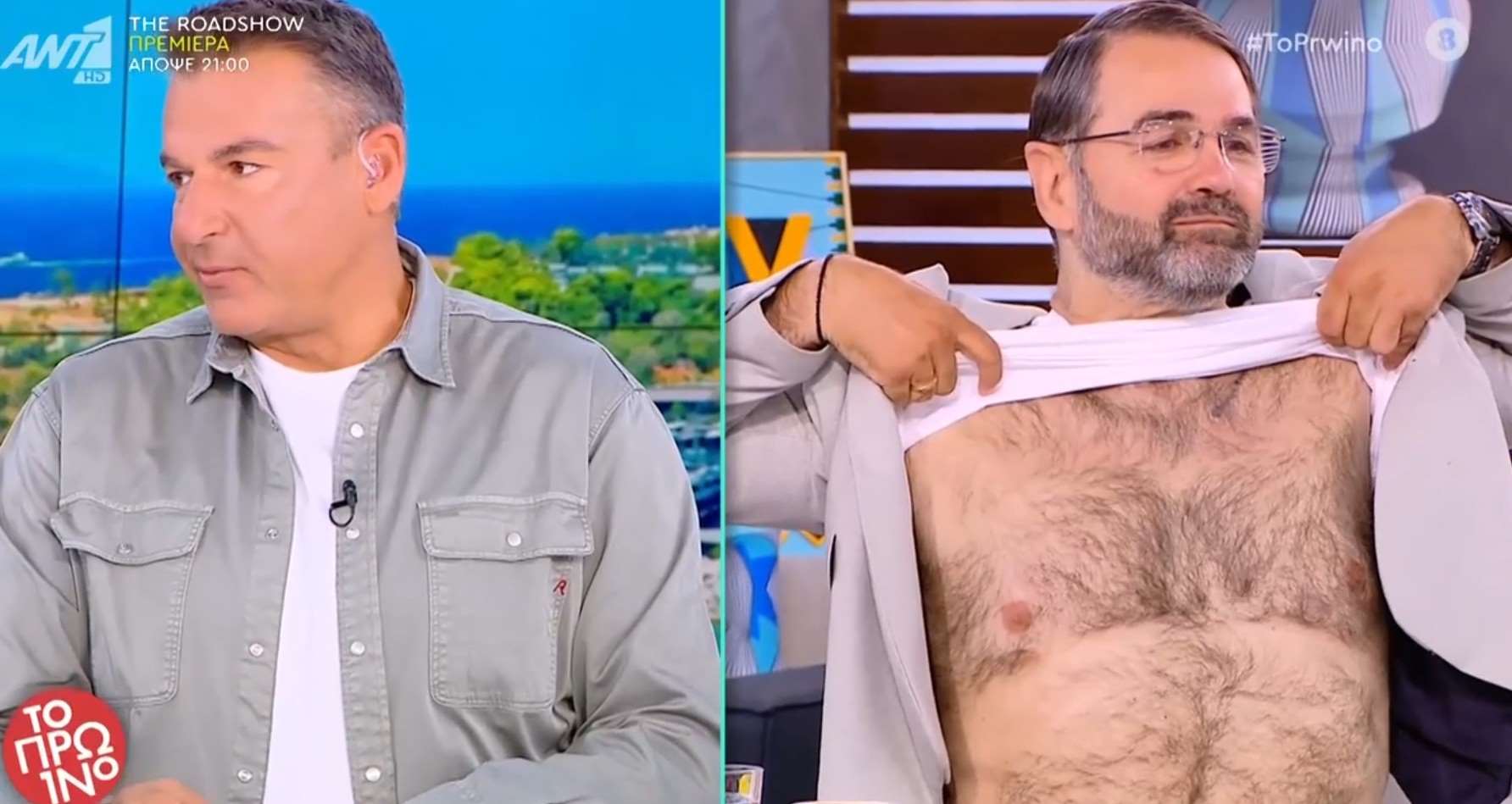 "Είμαι γεμάτος τρίχα", σχολίασε ο πρώην αστυνομικός, προκαλώντας αντιδράσεις από το πάνελ που δεν περίμενε μια τέτοια κίνηση. Ο ίδιος πρόσθεσε ότι "στην παραλία έτσι βγαίνω, δεν μ’ αρέσει να δείχνω το σώμα μου αλλά δεν θέλω και να τις κόψω".
