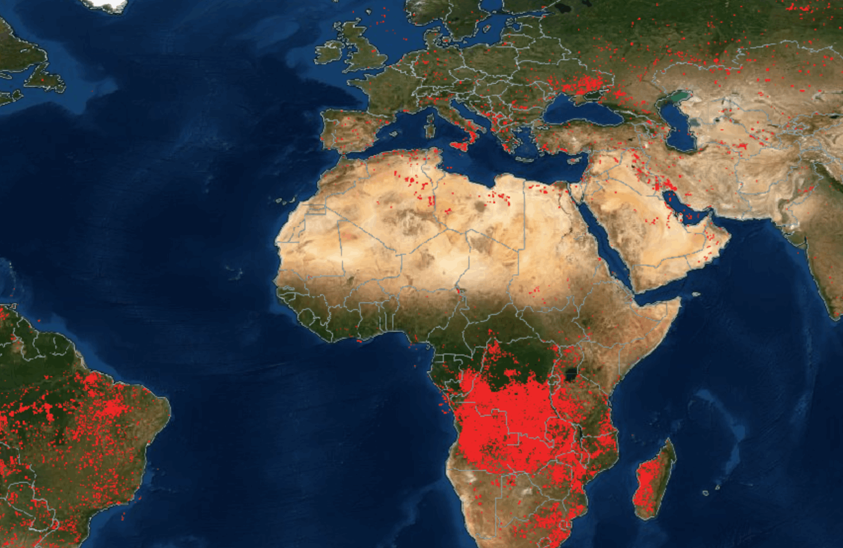 Η Διεθνής Υπηρεσία Διαστήματος καταγράφει τις πυρκαγιές σε οικουμενικό επίπεδο ανά 24ωρο. Σε αυτόν, παρατηρούμε μεταξύ άλλων τις χιλιάδες εστίες φωτιάς στη νότια Αφρική, τη Μαδαγασκάρη, τη λατινική Αμερική και τη βορειοανατολική Ασία.