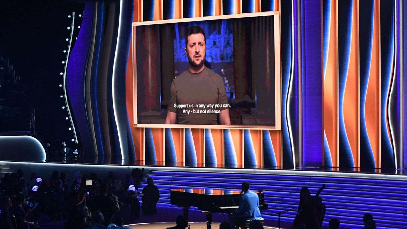 Παίρνοντας τη σκυτάλη, τα Grammys έθιξαν ανοιχτά το ζήτημα του πολέμου, παρουσιάζοντας ένα ηχογραφημένο μήνυμα του Ουκρανού Προέδρου. Ιδίως τη στιγμή που συμβαίνουν απίστευτες βαρβαρότητες στη χώρα με τον βασανισμό και τη δολοφονία άμαχων, σύμφωνα με όσα μεταδίδονται τις τελευταίες μέρες.