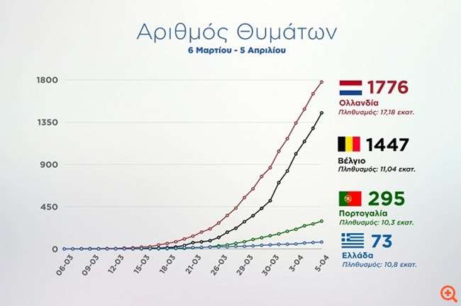Η τοποθέτηση του κ. Πέτσα συνοδεύτηκε από την αναφορά του σε δύο διαγράμματα που δείχνουν πώς εξελίσσεται η πανδημία (την περίοδο 26 Φεβρουαρίου - 5 Απριλίου) όσον αφορά τα κρούσματα και τους θανάτους στη χώρα σε σχέση με χώρες της υπόλοιπης Ευρώπης και συγκεκριμένα τις Πορτογαλία, Ολλανδία και Βέλγιο.
