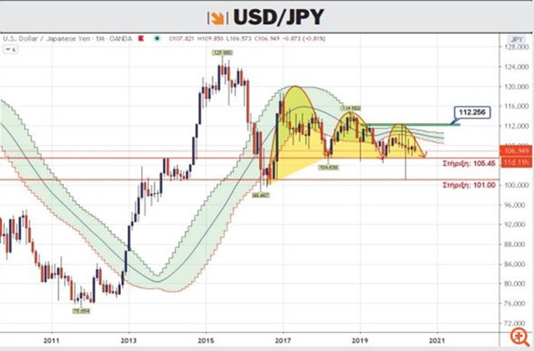 Την οικονομική της εκτίμηση αναβάθμισε για πρώτη φορά από το 2018 η κυβέρνηση της Ιαπωνίας, καθώς η απότομη επιδείνωση που προκλήθηκε από την πανδημία της COVID-19 έχει σχεδόν φτάσει στο τέλος της. Η Ιαπωνία αναμένεται το τρέχον τρίμηνο να υποστεί τη χειρότερη μεταπολεμική της ύφεση, όμως η εκτίμηση της κυβέρνησης ενθαρρύνεται από τις ενδείξεις βελτίωσης στις καταναλωτικές δαπάνες και το επιχειρηματικό κλίμα μετά τη σταδιακή άρση της κατάστασης έκτακτης ανάγκης. Σημάδια ενδυνάμωσης παρουσιάζει το γεν σε αναλογία με το δολάριο, USD/JPY, καθώς μπορεί να πήγε προς το κατώφλι των 110, αλλά επέστρεψε πολύ γρήγορα στη βάση των 107 με 106,5. Το μηνιαίο chart εμφανίζει μια στασιμότητα διαρκείας, με την αναλογία να παίζει, πλην σαθρών εξάρσεων, μέσα στο επίπεδο των 112 με 105, δίνοντας τροφή σε όσους Fx επενδυτές χρησιμοποιούν στοχαστικούς ταλαντωτές πλάγιας κίνησης.