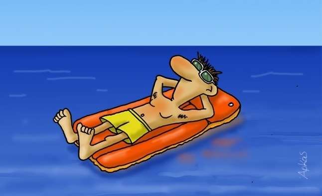 Στο σκίτσο βλέπουμε έναν άνδρα... αραχτό να απολαμβάνει το μπάνιο του στην παραλία, ενώ η λεζάντα της φωτογραφίας αναφέρει:
