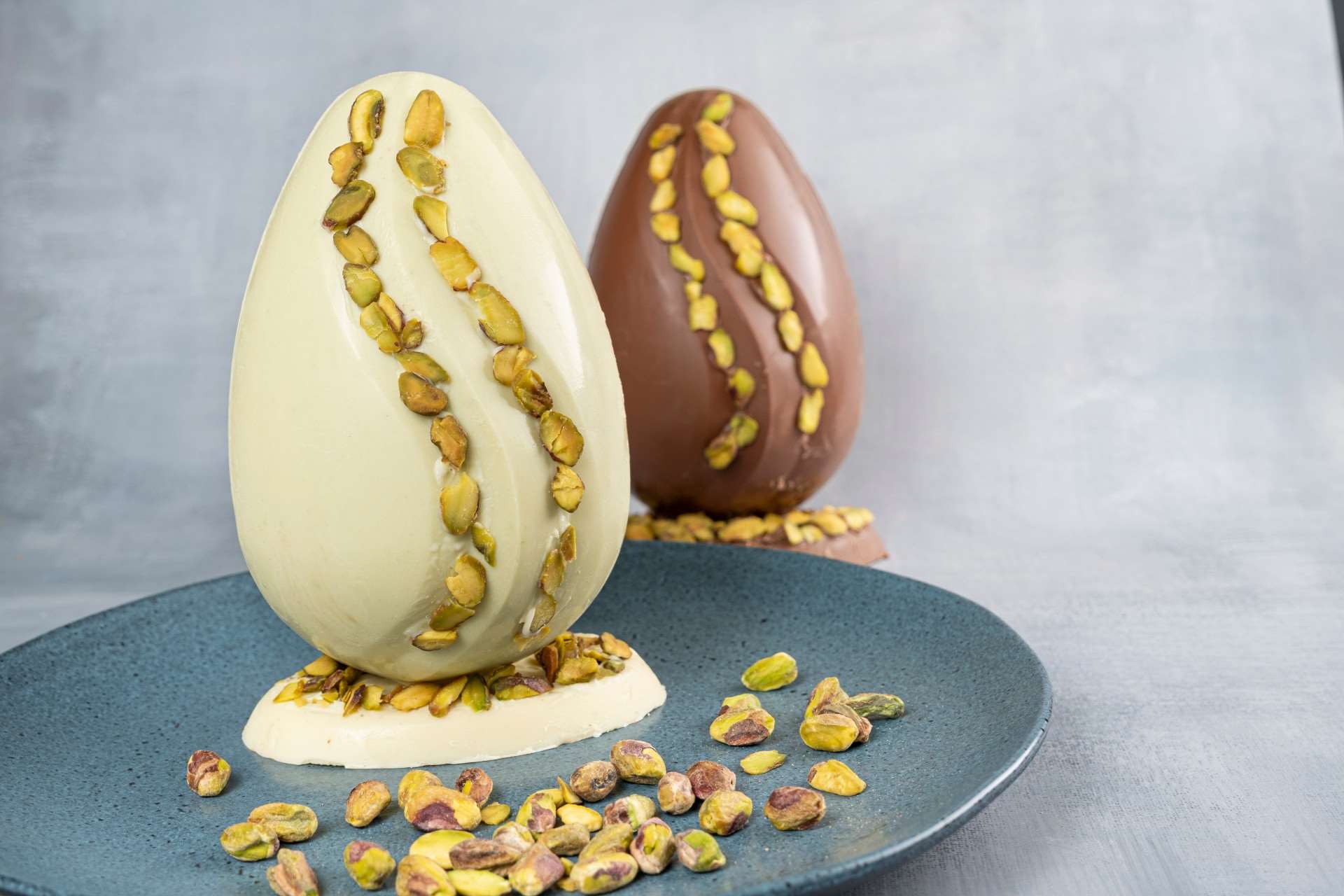 Συνεχίζουμε με το αβγό φουντούκι, με χειροποίητη καρδιά από πραλίνα φουντουκιού και επικάλυψη σοκολάτας γάλακτος με καραμελωμένα φουντούκια. Και φυσικά από την τριπλέτα δεν θα μπορούσε να λείπει το φιστίκι, με χειροποίητη καρδιά από μαρμελάδα βατόμουρο, semifreddo από πάστα φιστικιού Αιγίνης και επικάλυψη λευκής σοκολάτας και κομμάτια φιστικιού. Ένα επιπλέον μπράβο να πούμε που δεν έκαναν γεύση dubai chocolate.