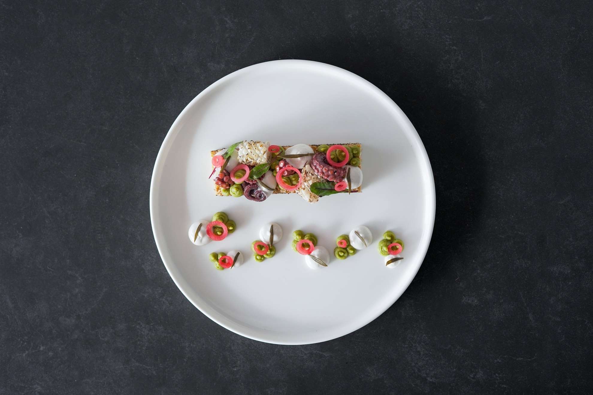 Φιλέτο ψαριού, ψητό, κρέμα πατάτας, ψητή καπνιστή μελιτζάνα, καπνιστή πάπρικα, κονκασέ από ντοματίνια, λαδολέμονο αχινού, αρωματικό ελαιόλαδο, σχοινόπρασο, ξύσμα από λεμόνι και μοσχολέμονο