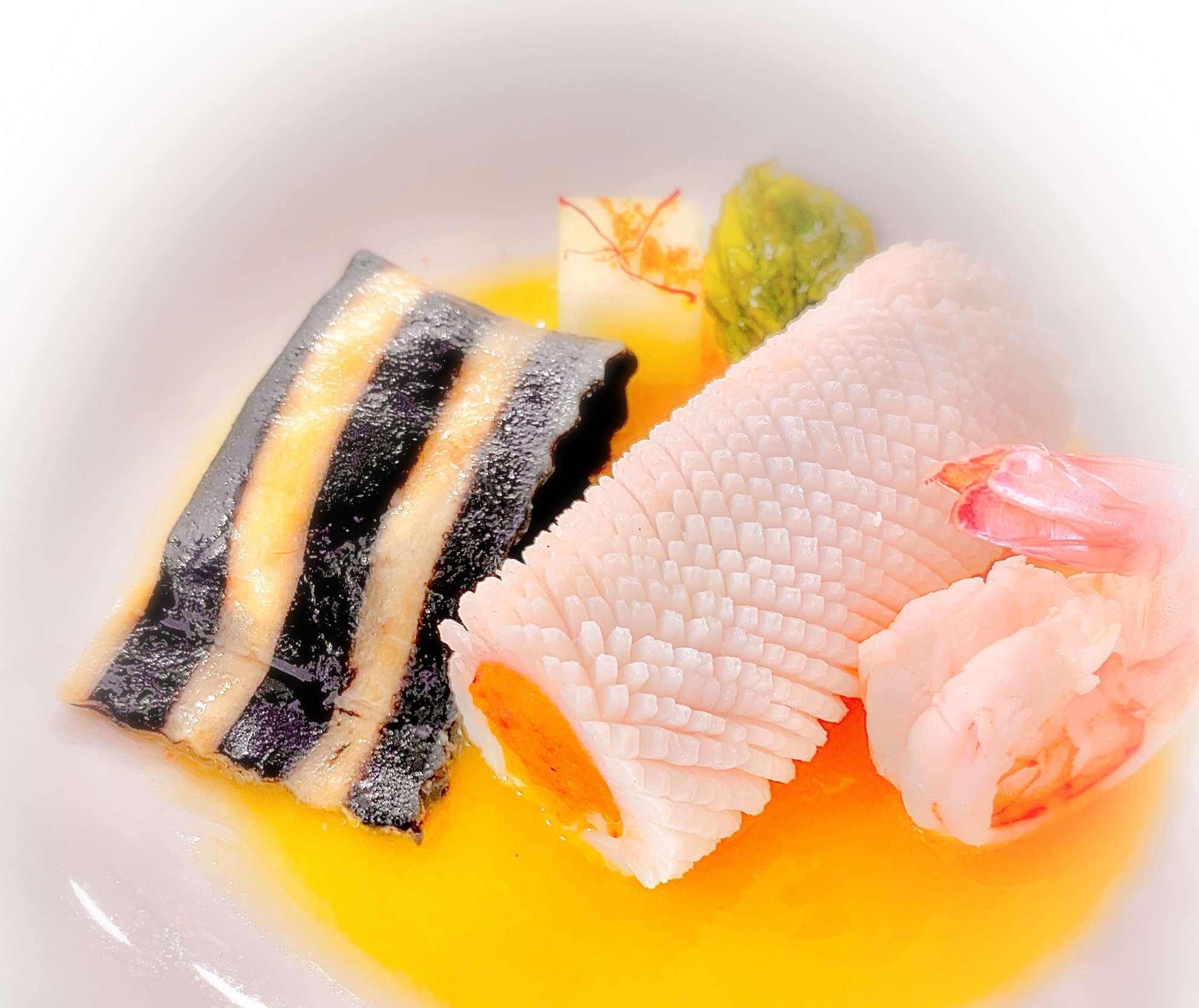 Βασιλικός ψαροζωμός "Κακαβιά" αρωματισμένος με κρόκο Κοζάνης και πατέ γαρίδας