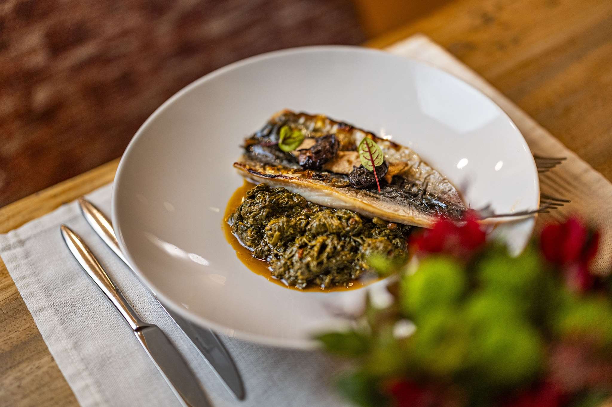 © Λεωνίδας ΤούμπανοςΤο κυρίως πιάτο σε ψάρι ήταν ένα πεντανόστιμο σκουμπρί στα κάρβουνα με τσιγαρέλι και τηγανητούς γίγαντες: το ψάρι συνόδευαν τα αβγά του κι ένα νόστιμο κερκυραϊκό τσιγαρέλι από σέσκουλα, σπανάκι και άλλα χόρτα της εποχής.