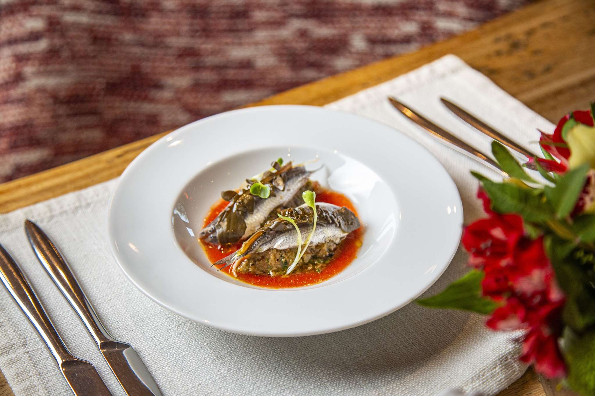 © Λεωνίδας ΤούμπανοςΣτο "καλωσόρισμα”, η ευγενική τηνιακή λούζα έδενε περίφημα με την παραδοσιακή γλίνα σε πιο λεπτή εκδοχή, δουλεμένη με αγελαδινό βούτυρο, ξύσμα λεμονιού και ρίγανη. Στα ορεκτικά, ένας έξοχος σε γεύση και υφή μαρινάτος γαύρος ήρθε επάνω σε γλυκοφάγωτη μελιτζανοσαλάτα με ταχίνι και πετιμέζι, ένας επιτυχημένος συνδυασμός.