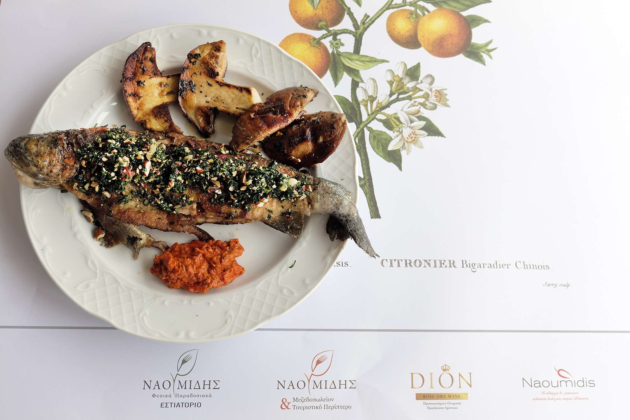 - Ορεκτικά: Μπρουσκέτα χωριάτικης πίτας με πέστο βιολογικής πιπεριάς Ναουμίδη και τσιγαρίδα μάγουλου μαύρου χοίρου Φλώρινας / Ντολμαδάκια από βιολογικό αμπελώνα Ξινόμαυρου Αμυνταίου με κέδρο και κατσικίσια ψητή φέτα Μινόπουλου / Ριζότο με μανιτάρι του Καίσαρα και φρέσκια μαύρη τρούφα Καϊμακτσαλάν