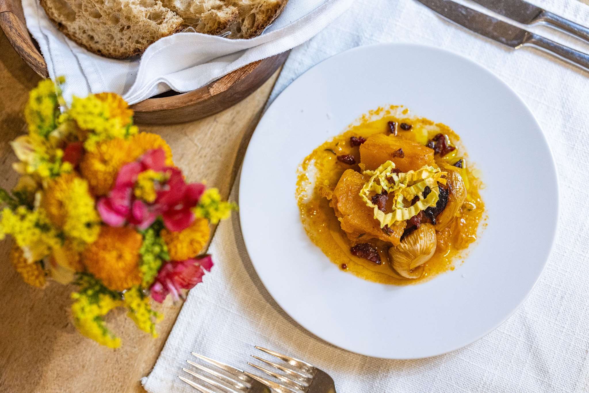 Στα ορεκτικά πάλι, ήρθε το "στιφάδο κολοκύθας” ένα καλομαγειρεμένο φαγάκι με μελωμένα κρεμμυδάκια, κομματάκια κολοκύθας, αρώματα πορτοκαλιού και τα τραγανά κομματάκια καλαματιανού λουκάνικου να κάνουν γευστικό παιχνίδι στο πιάτο.