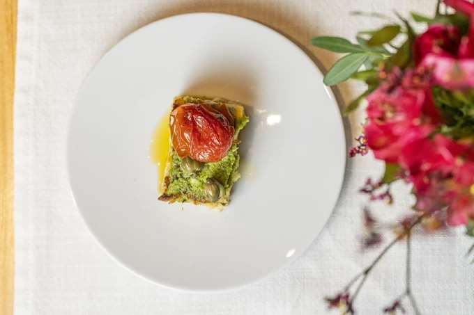 Ξεκινήσαμε τη γευστική βραδιά με πατατόπιτα με μαϊντανοσαλάτα και ψητά ντοματίνια, μια ελαφριά, αλλά γεμάτη υπόσχεση, πρόγευση που σου άνοιγε την όρεξη χωρίς να σε πνίγει -σαν καλωσόρισμα στο νησί πριν καν φτάσεις.