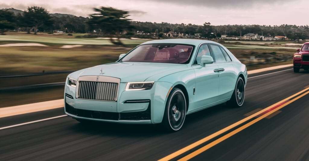 Μια πιο προσεκτική ματιά αποκαλύπτει μια λεπτή μαύρη γραμμή αμαξώματος που διατρέχει το μήκος του εξωτερικού του Ghost, που συμπληρώνει τις γραμμές καρφίτσας στις γυαλιστερές μαύρες ζάντες. Η Rolls δεν προσπαθεί να πουλήσει αυτά ακριβώς τα αυτοκίνητα, αλλά να επιδείξει την τεράστια ικανότητά της να δημιουργεί πραγματικά παραγγελίες κατά παραγγελία. Αν αυτό που απαιτείται δεν είναι διαθέσιμο από την παλέτα 44.000 αποχρώσεων της Rolls, θα φτιάξουν μια απόχρωση "Bespoke Signature Named" μόνο για εσένα.
