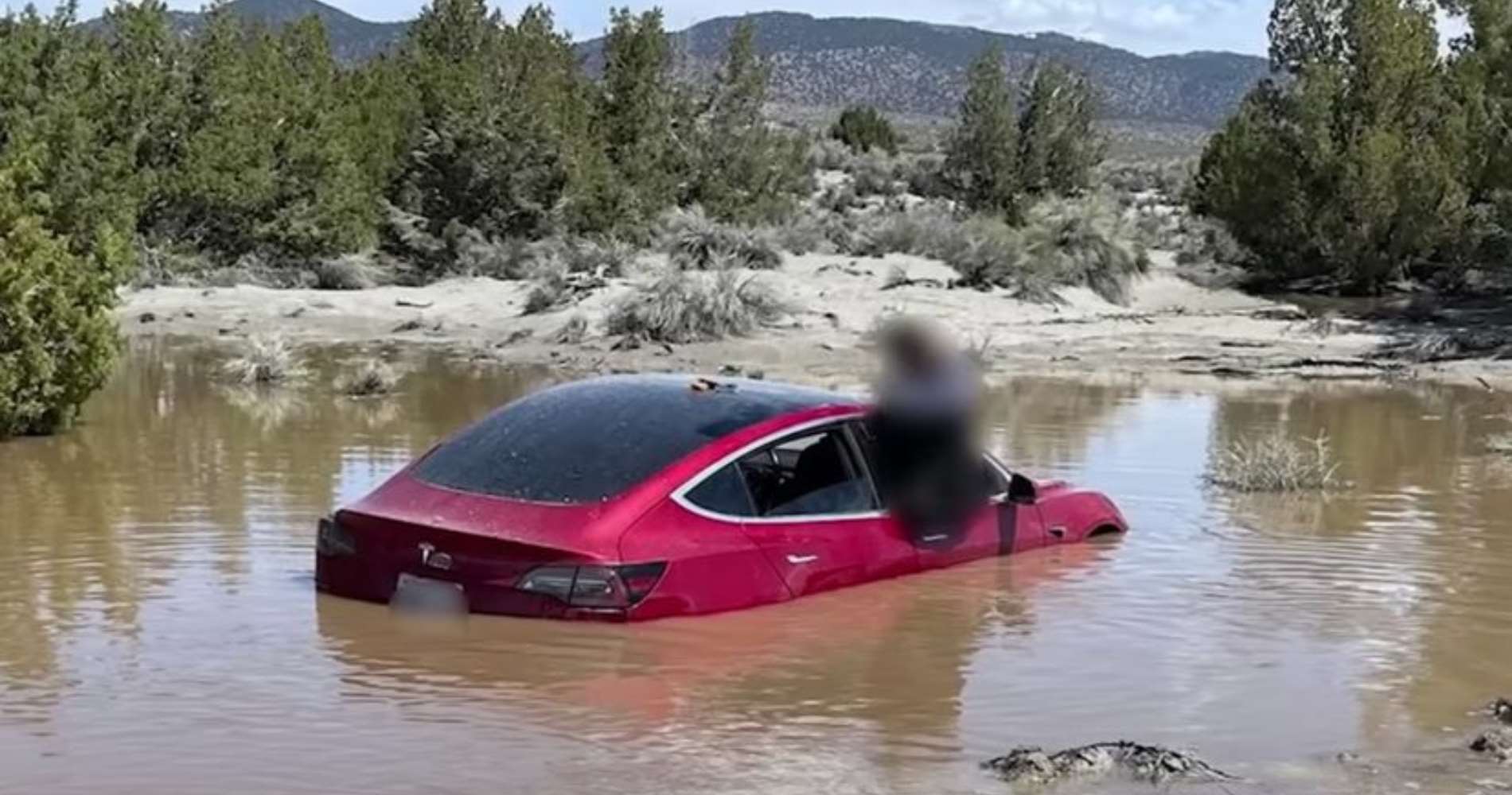 Τελικά αυτό το Model 3 κατέληξε σε λίμνη, αφού μπερδεύτηκε σε πλυμμηρισμένο δρόμο και ο οδηγός ρέμβαζε.