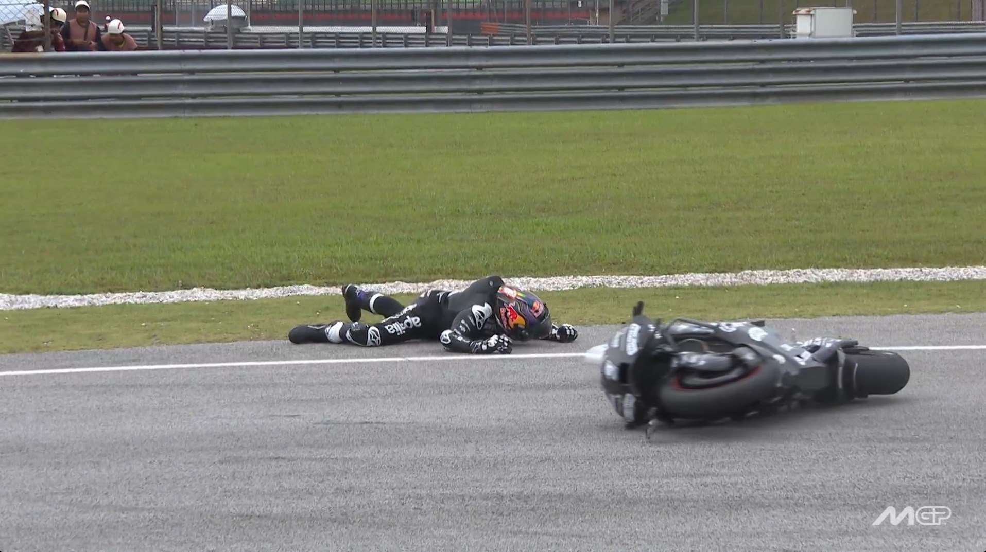 Η Aprilia RS-GP τον εκτίναξε βίαια στον αέρα, με αποτέλεσμα να περιστραφεί οριζόντια πριν προσγειωθεί άτσαλα στην άσφαλτο. Από τα πλάνα φαίνεται ότι το κεφάλι του χτύπησε με δύναμη στο έδαφος.