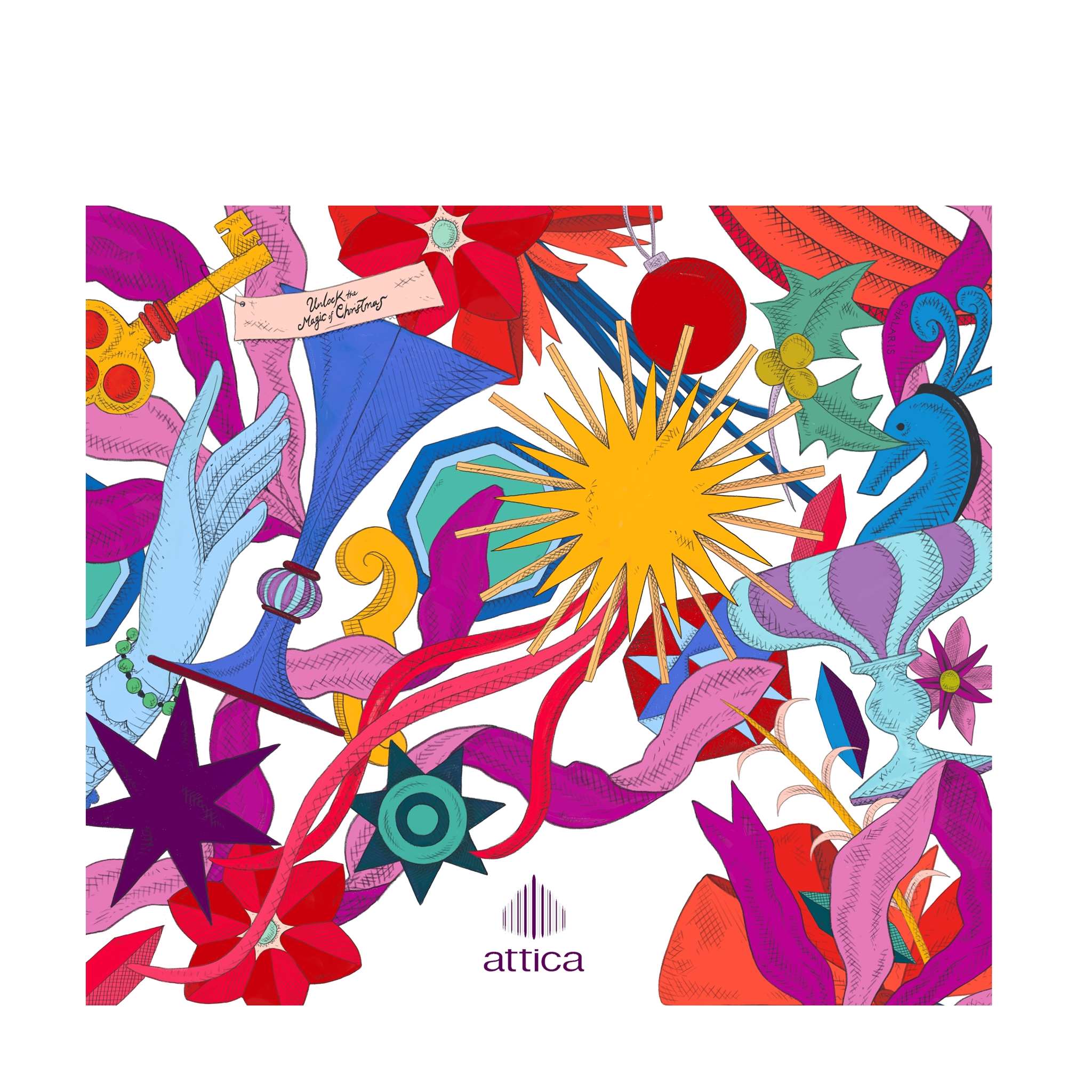 Τα κλασικά χριστουγεννιάτικα σύμβολα, όπως ένα αστέρι, ένα γκι, μια κόκκινη μπάλα, ένα ποτήρι σαμπάνιας, ένα γυναικείο γάντι και ένα παιδικό αλογάκι, δημιουργούν έναν σουρεαλιστικό κόσμο όπου συνυπάρχει το παραμύθι με την κομψότητα. Εκεί, στο επίκεντρο, το χρυσό κλειδί των attica αντιπροσωπεύει τη δύναμη που υπάρχει μέσα μας και μας ωθεί στο να ξεκλειδώσουμε τις ξεχωριστές στιγμές που επιθυμούμε να ζήσουμε κατά τη διάρκεια των Χριστουγέννων.