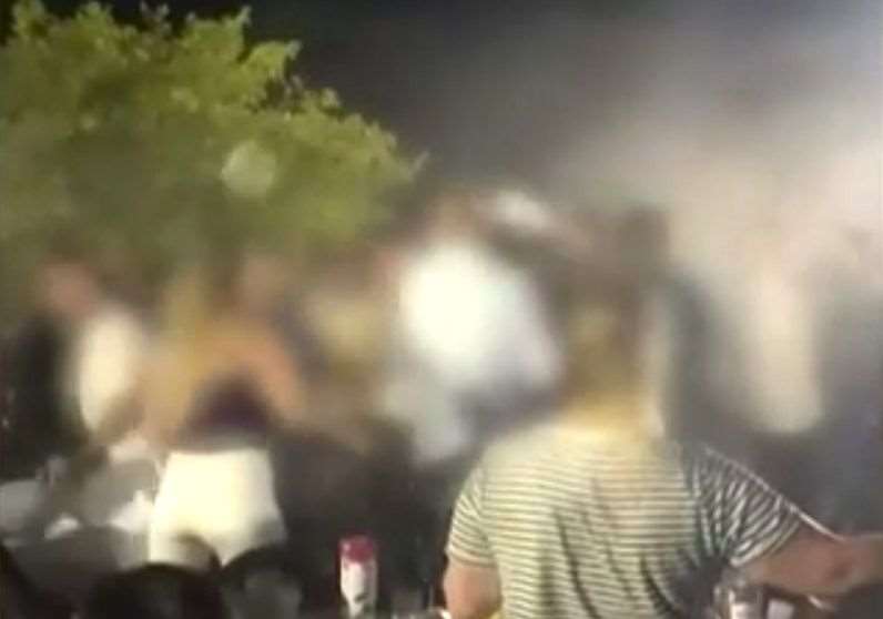 Δύο παρέες ανδρών φαίνεται πως είχαν προηγούμενα και, χωρίς πολλή σκέψη, αποφάσισαν να λύσουν τις διαφορές τους μπροστά σε δεκάδες θεατές. Το βίντεο που κυκλοφόρησε δείχνει το μέγεθος της έντασης: καρέκλες, τραπέζια και μπουκάλια να εκτοξεύονται μέσα στον κόσμο, ενώ η μουσική συνέχιζε στο background, μέχρι να αντιληφθούν οι μουσικοί τι γινόταν.