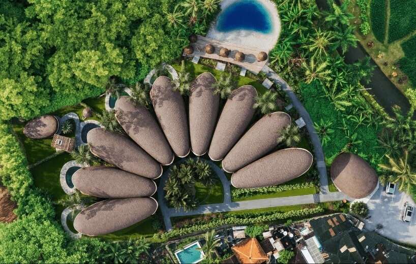 Το Blooming Ring του Μπαλί σχεδιάστηκε από το αρχιτεκτονικό γραφείο Archigods, που αντλεί έμπνευση από τα φυστίκια ακόμη και στο σχήμα του. Οι εννέα βίλες του, πράγματι, μοιάζουν με φυστίκια ή, για όσους διαθέτουν πιο δημιουργική φαντασία, με ανοιχτά κοχύλια, διατεταγμένες σε κύκλο γύρω από έναν καταπράσινο εσωτερικό κήπο. Πρόκειται για αληθινές οάσεις γαλήνης.