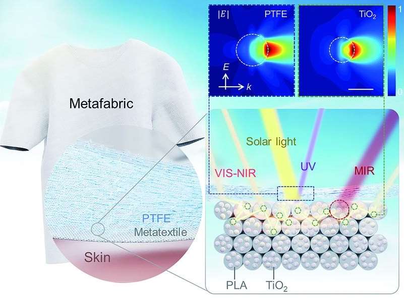 Το μετα-ύφασμα που μπορεί να βαφτεί σε διάφορα χρώματα και είναι φτιαγμένο από πολυλακτικό οξύ, συνθετικές ίνες Τεφλόν και νανοσωματίδια από διοξείδιο του τιτανίου (που υπάρχουν και στα αντηλιακά), ανακλά επίσης στο διάστημα την υπεριώδη ακτινοβολία, την ορατή και την εγγύς υπέρυθρη, πράγμα που επιτρέπει τη μεγαλύτερη μείωση της θερμοκρασίας του σώματος.
