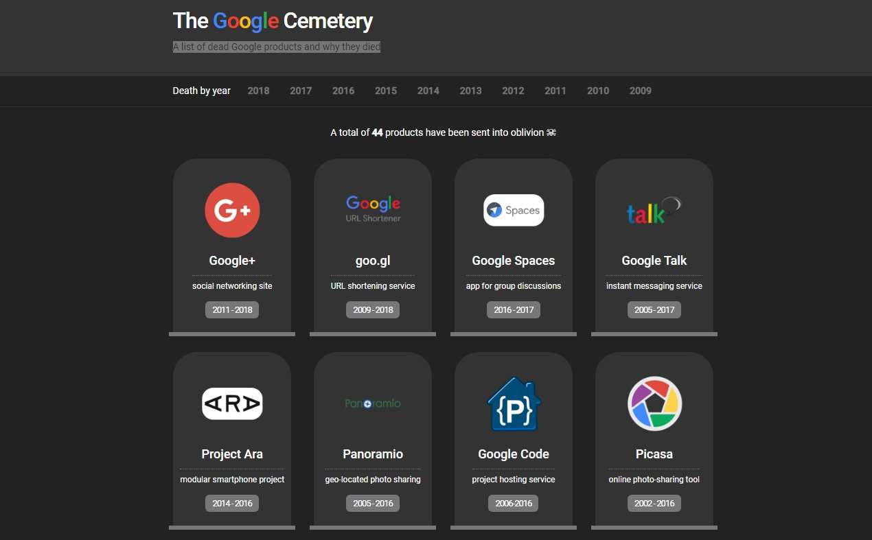 Το Google Graveyard μάλιστα ξεκινά να ανοίγει και καινούριους τάφους για τα προϊόντα της Google που μοιάζουν έτοιμα να αποχαιρετήσουν τον μάταιο τούτο ιντερνετικό κόσμο σε λίγο καιρό.