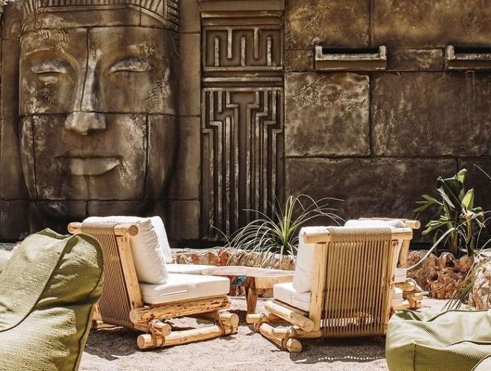 Ο χώρος του είναι αρχικά εκείνος που παίζει το ρόλο του wow factor, με boho αισθητική, πάρα πολλές εξωτικές πινελιές και στοιχεία που εντυπωσιάζουν, όπως τα αγάλματα που περιμετρικά είναι τοποθετημένα σε αυτό. Έπειτα, η ενδιαφέρουσα δουλειά που έχει γίνει σε ποτό και φαγητό.
