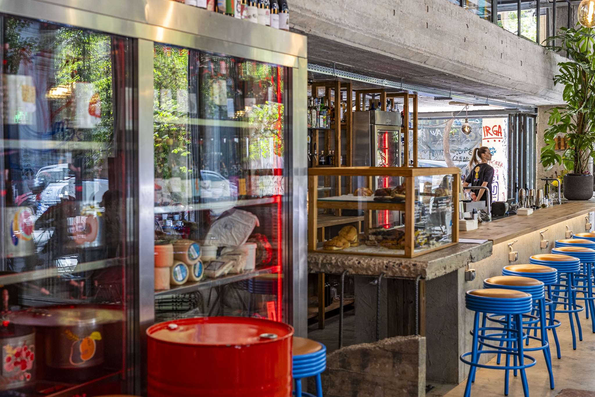 Χώρος κουλ και άμεσος, με πάντρεμα του γυμνού σκυροδέματος με το ανοξείδωτο ατσάλι (συν το πολύ καλό branding της Ελένης Σακαλή), τζαμαρίες που δεν κόβουν τίποτα από την εξωτερική πλευρά και τραπέζια που διαμοιράζονται στα πεζοδρόμια, τόσο επί της Μαυρομιχάλη όσο και επί της –κάθετης στην πρώτη– Αραχώβης.