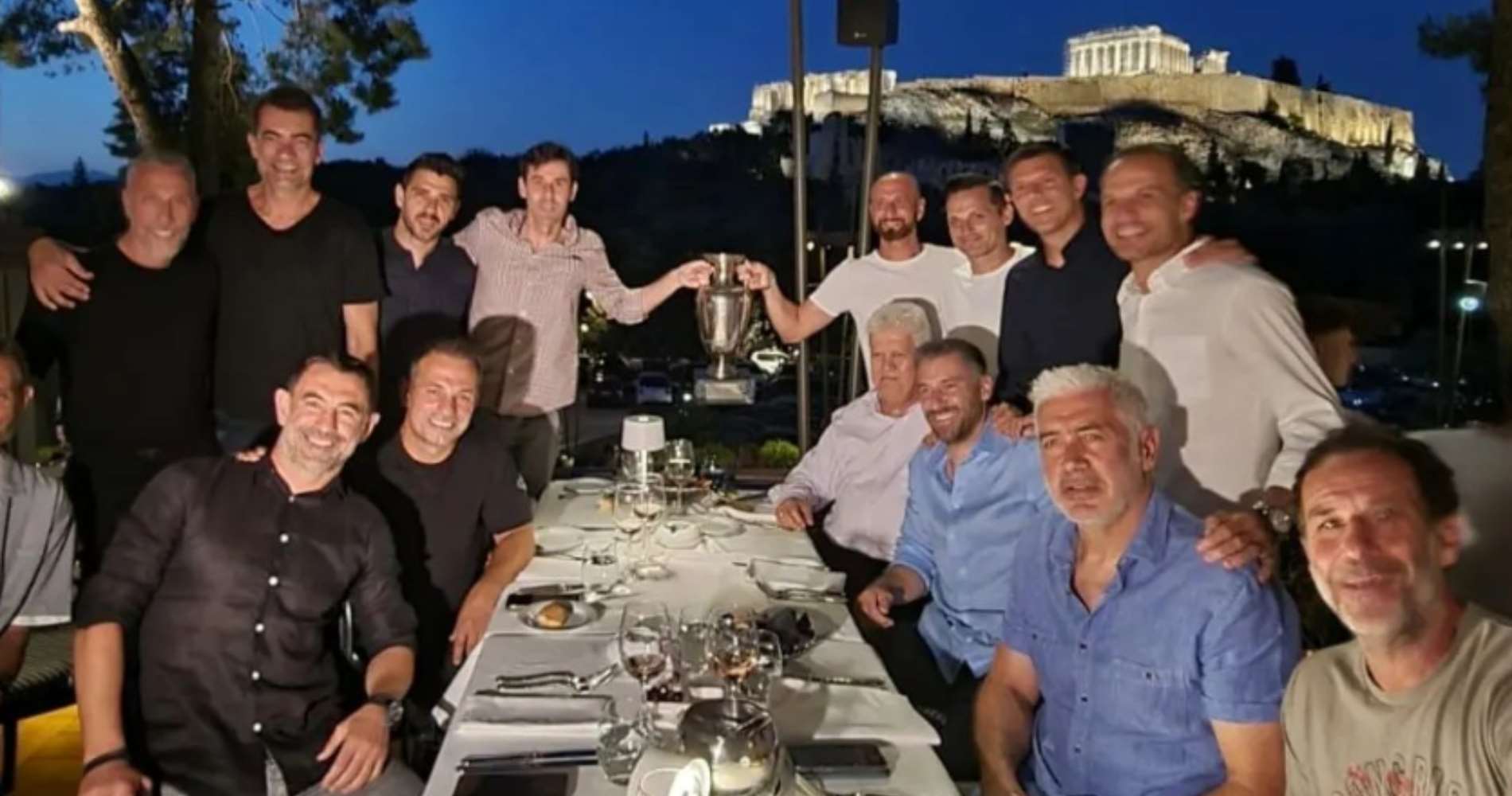 Έκαναν reunion, σε εστιατόριο με φόντο την Ακρόπολη και φυσικά είχαν μαζί τους και το βαρύτιμο τρόπαιο. Ο Αντώνης Νικοπολίδης ανέβασε στα social media τη σχετική φωτογραφία και μπορεί κανείς να διακρίνει τους Καφέ, Χαλκιά, Κατσουράνη, Τσιάρτα (όρθιοι από αριστερά), Καραγκούνη, Νικολαΐδη (καθιστοί) - Παπαδόπουλο, Λάκη, Φύσσα, Μπασινά (όρθιοι), Γκούμα, Νικοπολίδη, Σεϊταρίδη και τον τότε πρόεδρο της ΕΠΟ Γκαγκάτσης.
