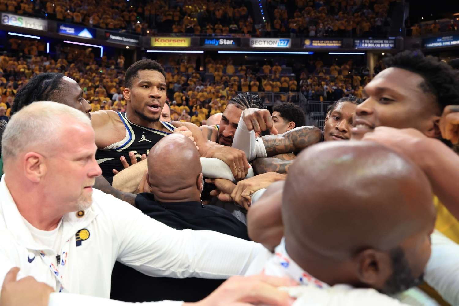 Παρά την ένταση και το αναμενόμενο trash talking ανάμεσα στις δύο πλευρές ο Γιάννης Αντετοκούνμπο χαιρέτησε όλους τους αντιπάλους του, μέχρι να φτάσει στον Μπεν Μάθουριν. Τότε ο σταρ των Μπακς φαίνεται να ανταλλάζει μερικές κουβέντες με τον παίκτη των Πέισερς και επενέβησαν άμεσα οι ψυχραιμότεροι, ώστε να αποφευχθεί μία σύρραξη.
