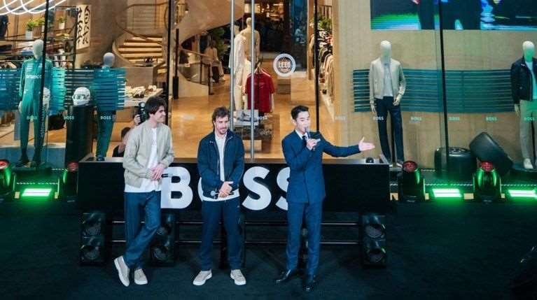 Το απόγευμα της Τετάρτης 19 Μαρτίου, οι οδηγοί της Aston Martin Aramco Formula One™ Team και πρεσβευτές της BOSS, Lance Stroll και Fernando Alonso, υποδέχθηκαν περίπου 80 VIP καλεσμένους, διασημότητες, εκπροσώπους των ΜΜΕ και δημιουργούς περιεχομένου σε ένα κομψό μαύρο χαλί μπροστά από τη μεγαλοπρεπή 18 μέτρων πρόσοψη του καταστήματος, η οποία ήταν διακοσμημένη με σχέδιο εμπνευσμένο από την Πίστα της Σαγκάης και το κινέζικο σύμβολο "上" (shang), που σημαίνει "άνοδος" και εκφράζει αισιοδοξία και θετικότητα—μια τέλεια ευθυγράμμιση με το πνεύμα της BOSS.