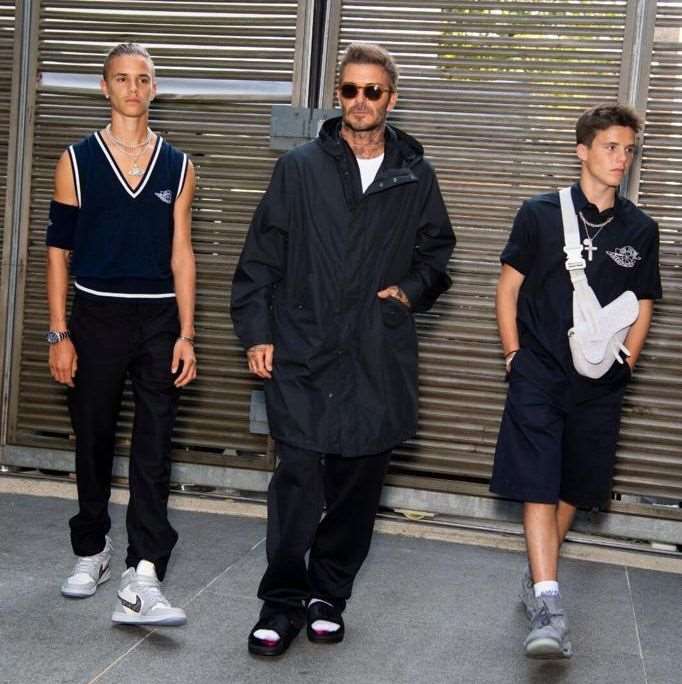 O Becks επένδυσε στις δημιουργίες του οίκου Dior, ενώ οι γιοι του επέλεξαν κομμάτια από τη συλλεκτική, sold out συλλογή Dior x Air Jordan, που έχει αναδειχθεί στη συνεργασία της χρονιάς στον χώρο της βιομηχανίας της μόδας. Και οι τρεις έχτισαν ασπρόμαυρα σύνολα που αποθεώνουν το coolness του sportswear και δεν χάνουν σε κομψότητα παρά τον casual, αθλητικό τους χαρακτήρα.