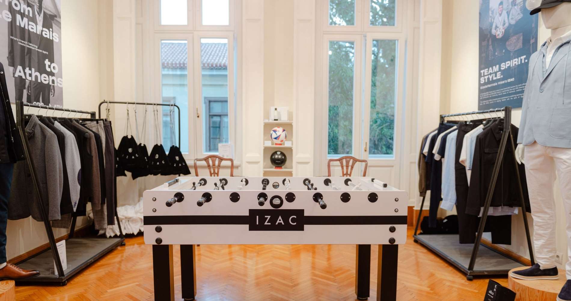 Στο Room 2 του εμβληματικού κτιρίου της Αμαλίας 36, η IZAC δημιούργησε έναν χώρο που ήταν κάτι παραπάνω από μια απλή έκθεση ρούχων. Οι καλεσμένοι είχαν την ευκαιρία να βυθιστούν στον κόσμο του brand, βλέποντας από κοντά τις διαχρονικές δημιουργίες του. Το highlight της βραδιάς ήταν το πιο stylish ποδοσφαιράκι. Αυτό το concept, που ένωσε το παιχνίδι με τη μόδα, πρόσθεσε μία απίστευτα διασκεδαστική και χαλαρή νότα στην εκδήλωση.