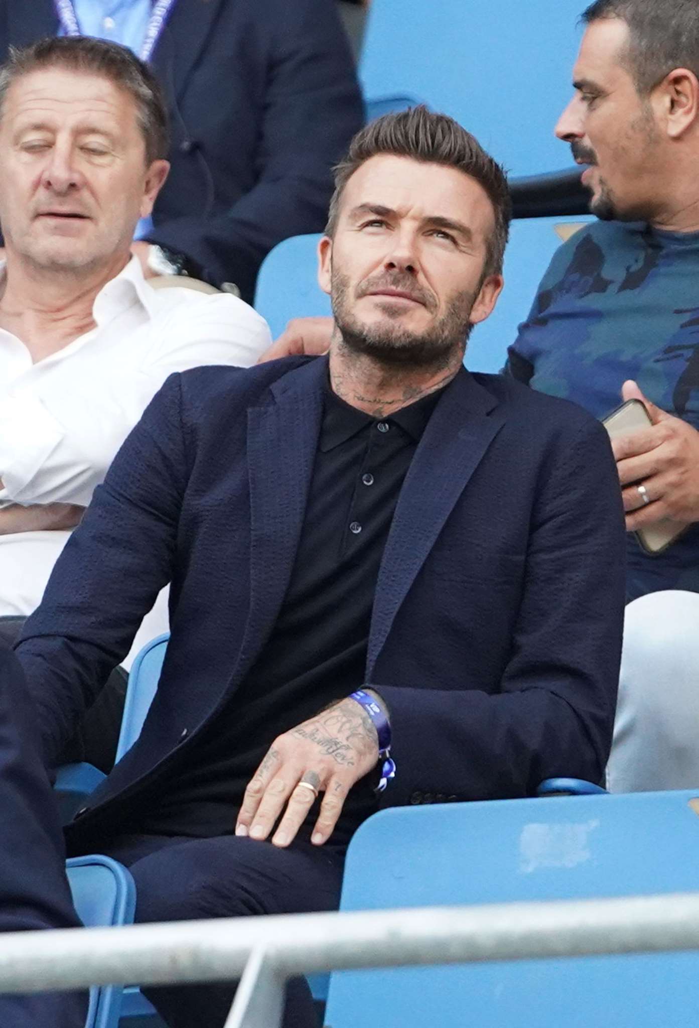 Κομψός και χαλαρός, ο Becks φόρεσε ένα navy blue seersucker κοστούμι φτιαγμένο από το χαρακτηριστικό γκοφρέ, δροσερό ύφασμα -λόγω της ζαρωμένης ύφανσής του, καθιστά περιττό το σιδέρωμα, ενώ αφήνει το δέρμα να αναπνέει-, συνδυασμένο όχι με πουκάμισο, ούτε με t-shirt. Προτίμησε ένα polo μπλουζάκι σε μαύρο χρώμα και δεν ξέχασε να κουμπώσει και τα τρία κουμπιά του για να χαρίσει έξτρα επισημότητα στο σύνολο, από τη στιγμή που επέλεξε να μην το ζώσει μέσα από το παντελόνι.